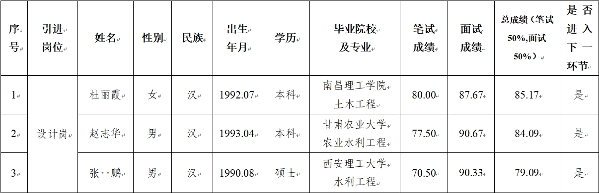 2024-09-25根據(jù)《平?jīng)鍪袥軚|水利水電勘測設計有限責任公司2024年特殊人才招聘公告》,市產(chǎn)投集團在組織報名、資格審查的基礎上,按程序完成了筆試、面試工作,現(xiàn)將筆試、面試成績公示如下:? ? ? ? ? ?